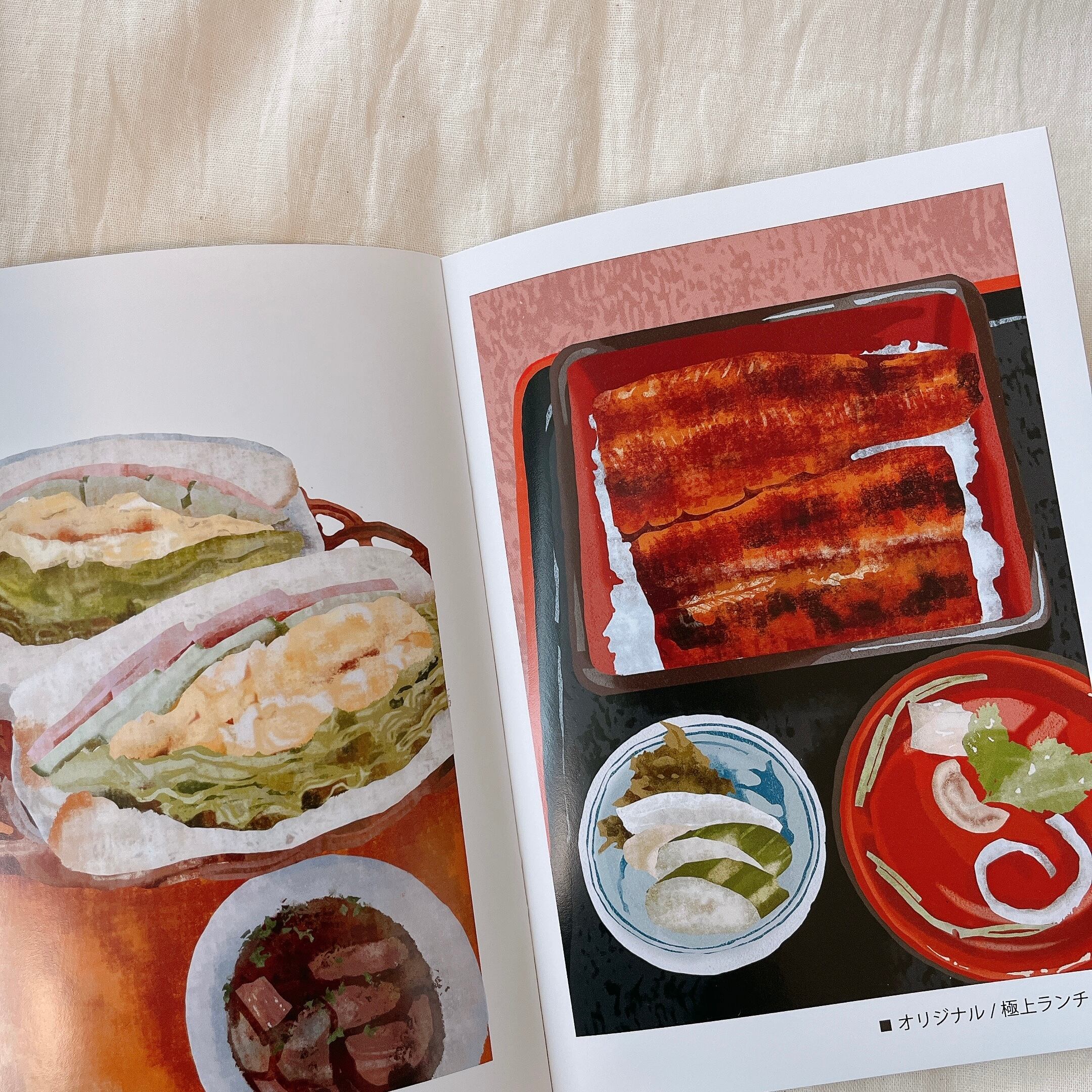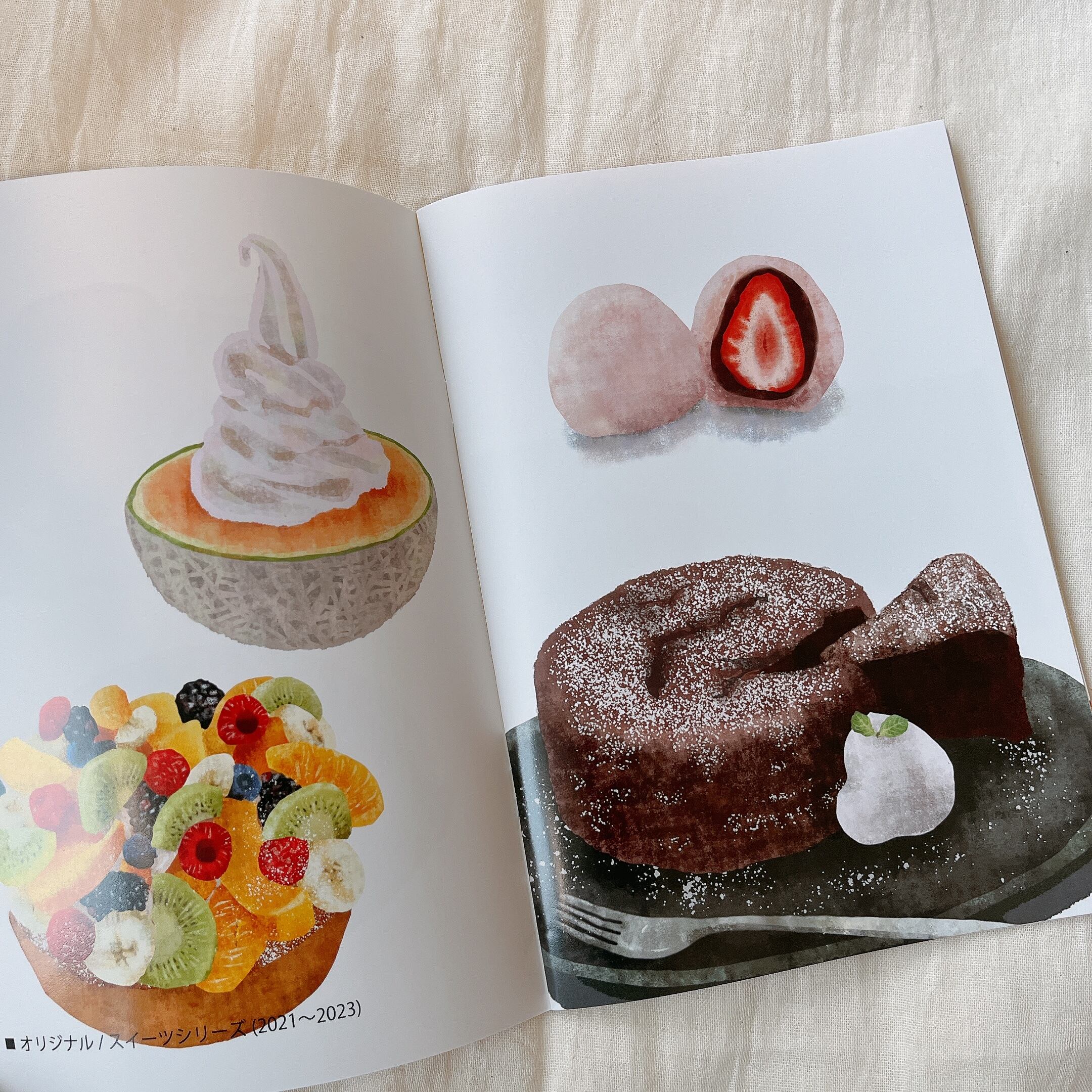 この作品集には、初期の頃からこれまで、私が描いた美味しそうなイラストが詰まっています。ご飯やスイーツ、ランチで食べたものを描いていたり、企画展などに展示した作品や、お仕事で描いた作品も掲載。お部屋のインテリアとしても楽しめる、作品集となっております。