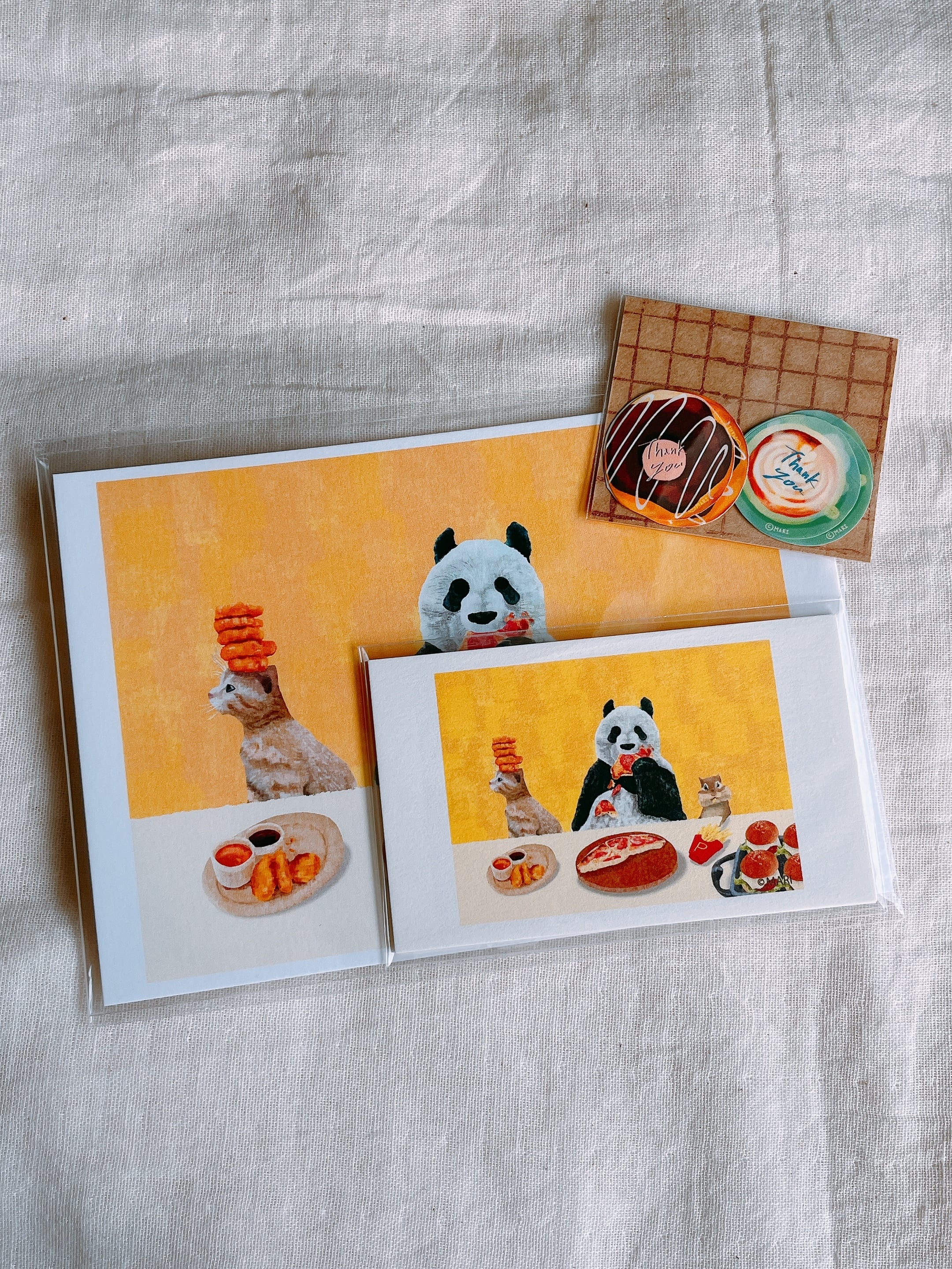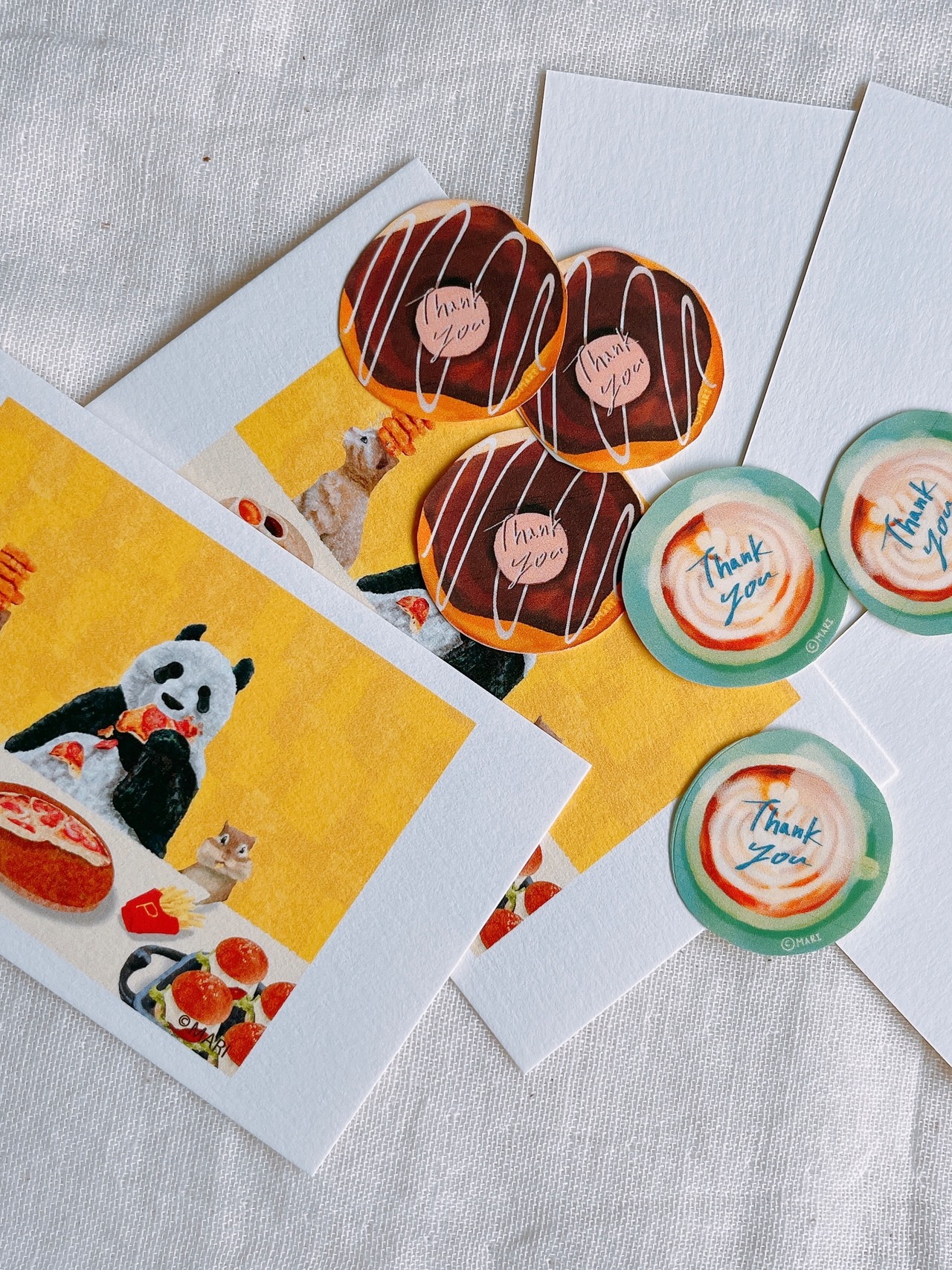 「それぞれ」ポストカード1枚、メッセージカード5枚、サンキューシール2種類3枚ずつ。