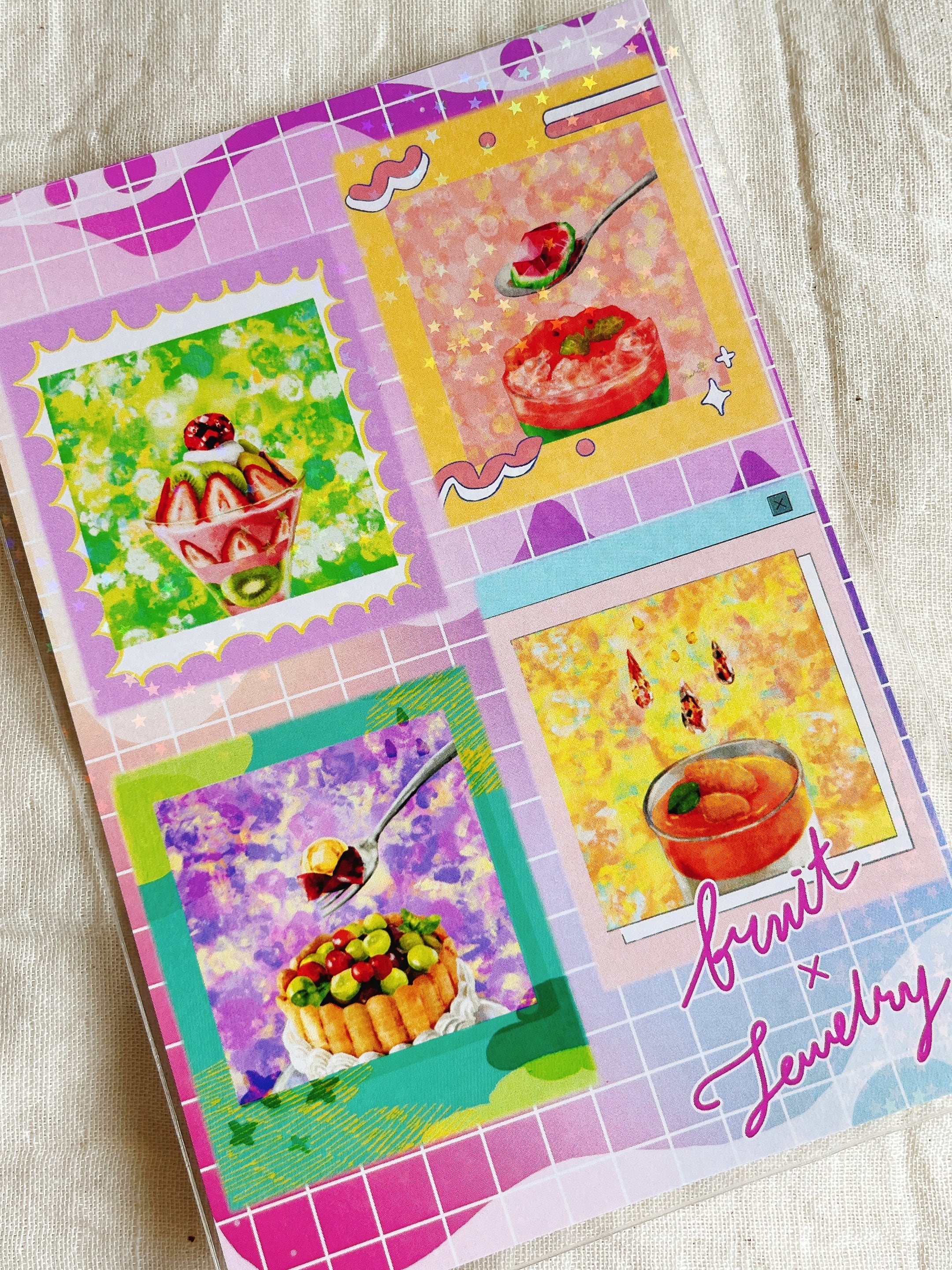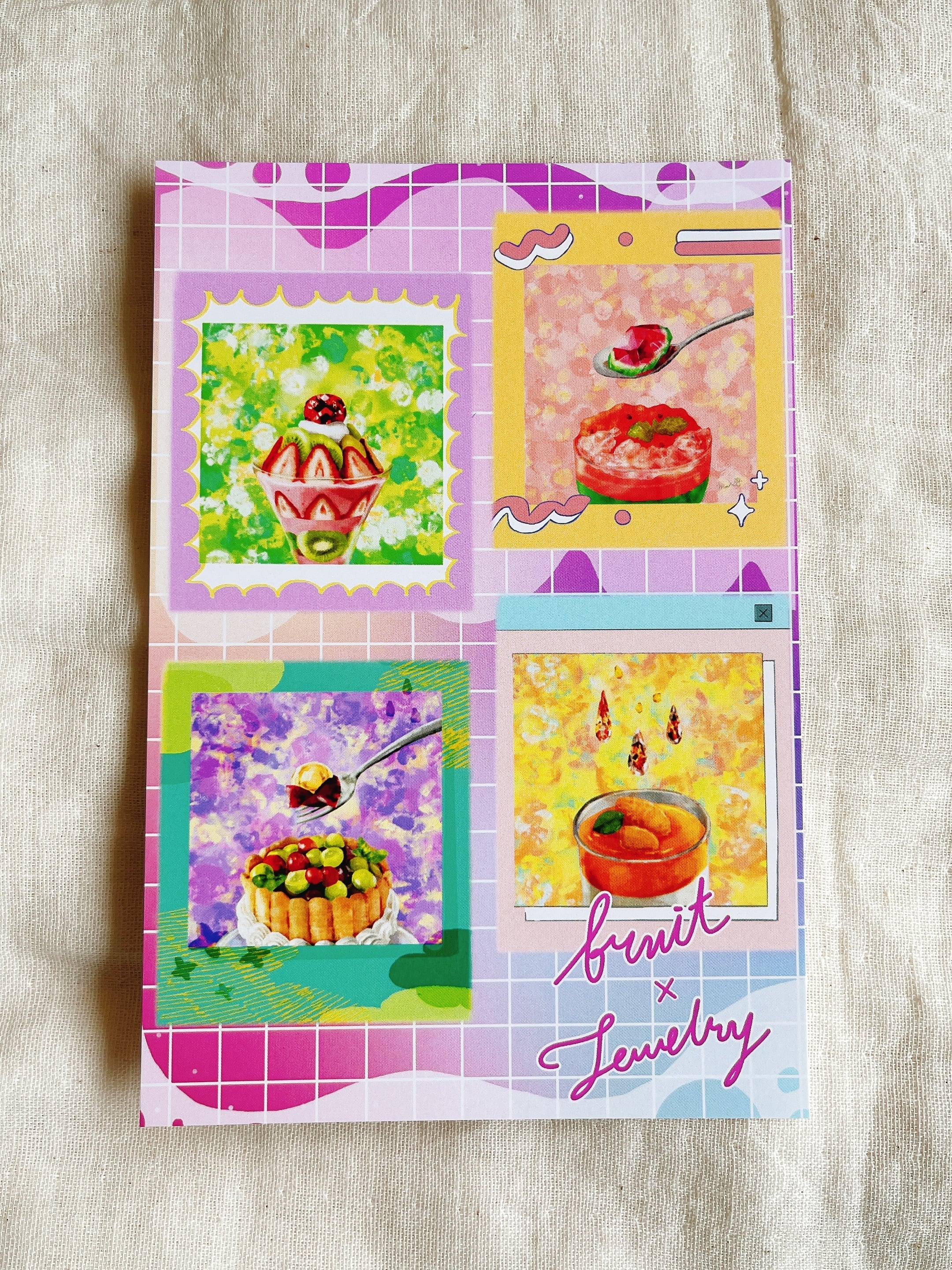 "春の宝石"、"夏の宝石"、"秋の宝石"、"冬の宝石"の作品たちを1枚のポストカードに、さらにPOPに仕上げました。
