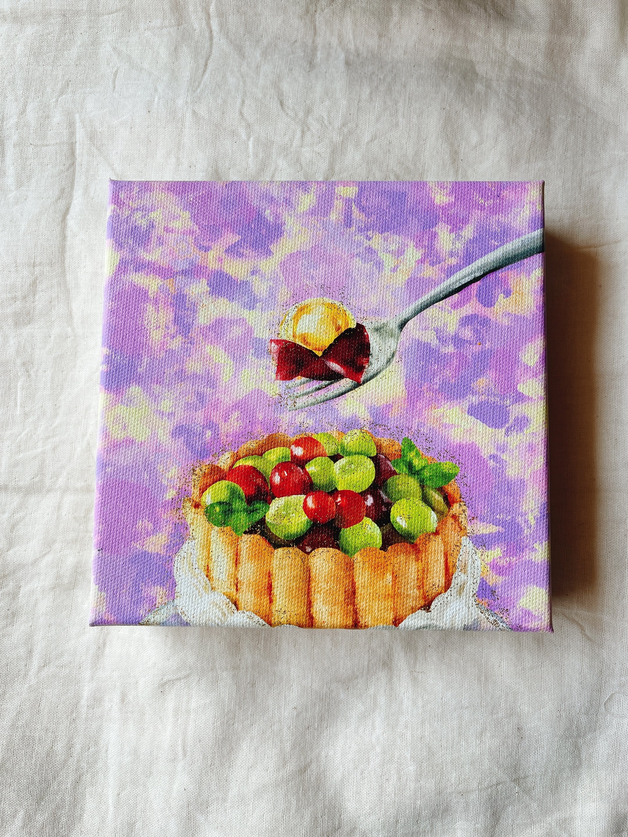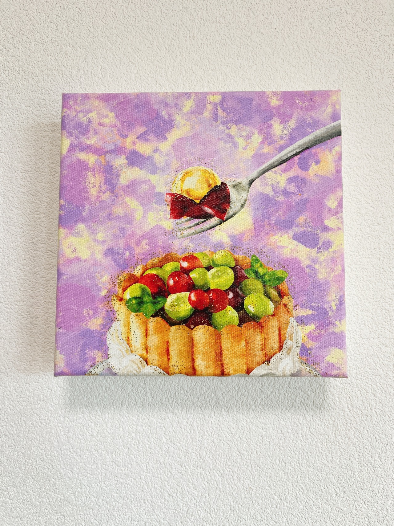 デジタル版画の上に、キラキラのアクリル絵の具を重ねて仕上げています。